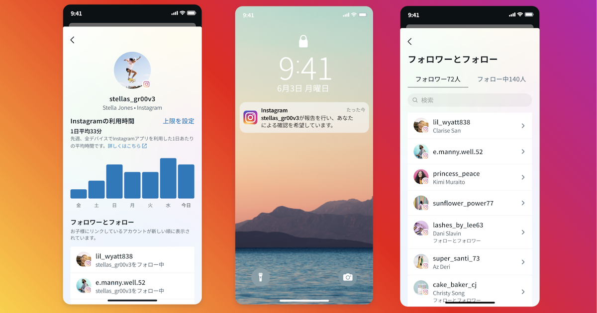 子どものアプリの利用時間について親が上限を設定したり、フォロー関係にあるアカウントを確認したりすることが可能で、SNS(交流サイト)の使いすぎや不適切なやりとりなどから子どもを守るための仕組みを強化します。